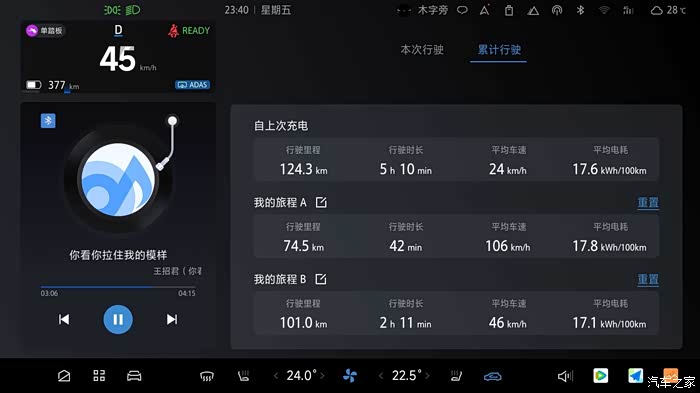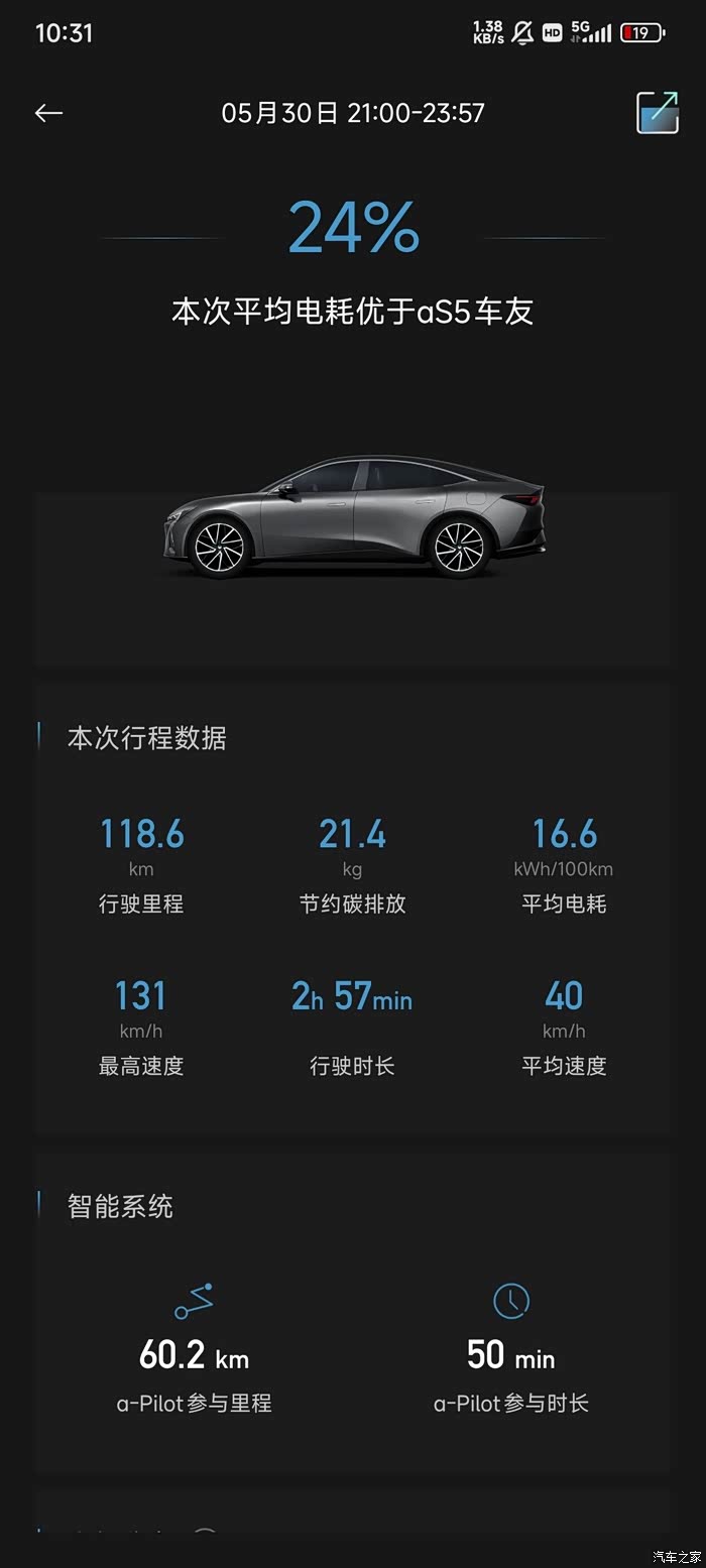 这次出行,我还特意留意了一下电耗。回乡118公里,全程开着空调、听着音乐、座椅通风也没停过,还堵了一个多小时的车,全程平均电耗16.6 ,这个成绩我觉得相当不错了。我还单独记录了一下高速电耗,高速里程74.5公里,基本都是高于125的时速在跑,平均车速106,平均电耗17.8,在这种高速行驶且开着各种设备的工况下,这个电耗表现真的让我很惊喜。