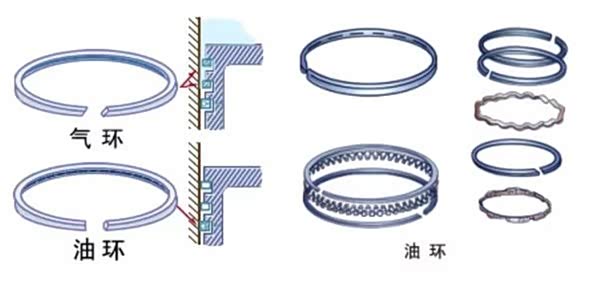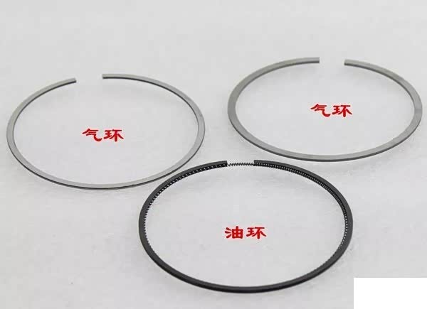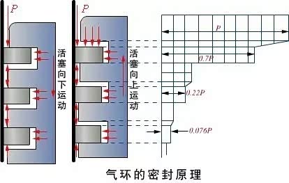这三个间隙使活塞环形成了两个密封面和一个迷宫式的漏气通道。其中第一道气环大约密封80~90%的气体,第二道气环大约密封10~20%的气体,油环大约密封5%的气体。