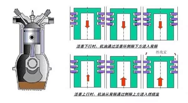 当活塞在气缸中向上运动时,机油就从活塞环的背隙进入侧隙上方,然后被送入燃烧室参与燃烧。这个过程在发动机运行过程中反复不断的进行,机油就被逐渐的消耗掉了。