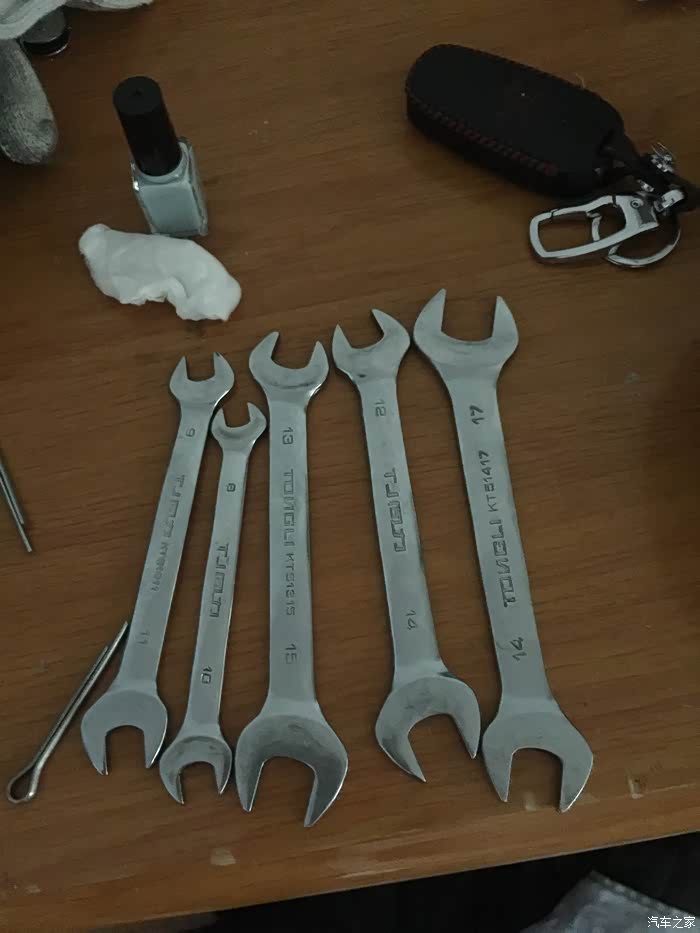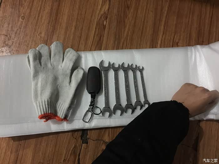 来看看吧我准备的工具就是这么多,手套(公司顺回来)、套袖(公司顺回来的)、泡沫纸(公司顺回来的)、扳手(公司借的)、车钥匙(我自己的)。。。