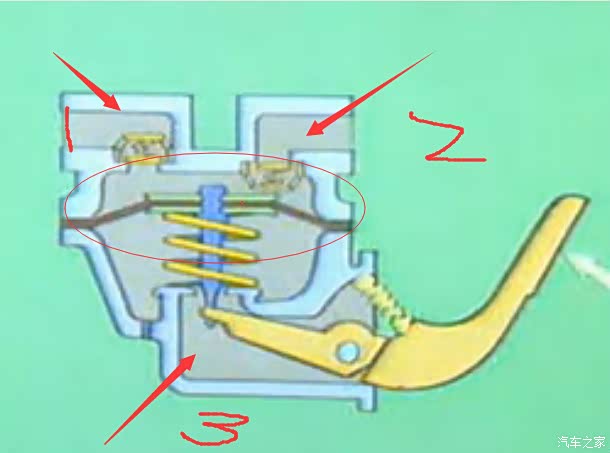当3支架往下拉时气压减小阀2打开,汽油进入。