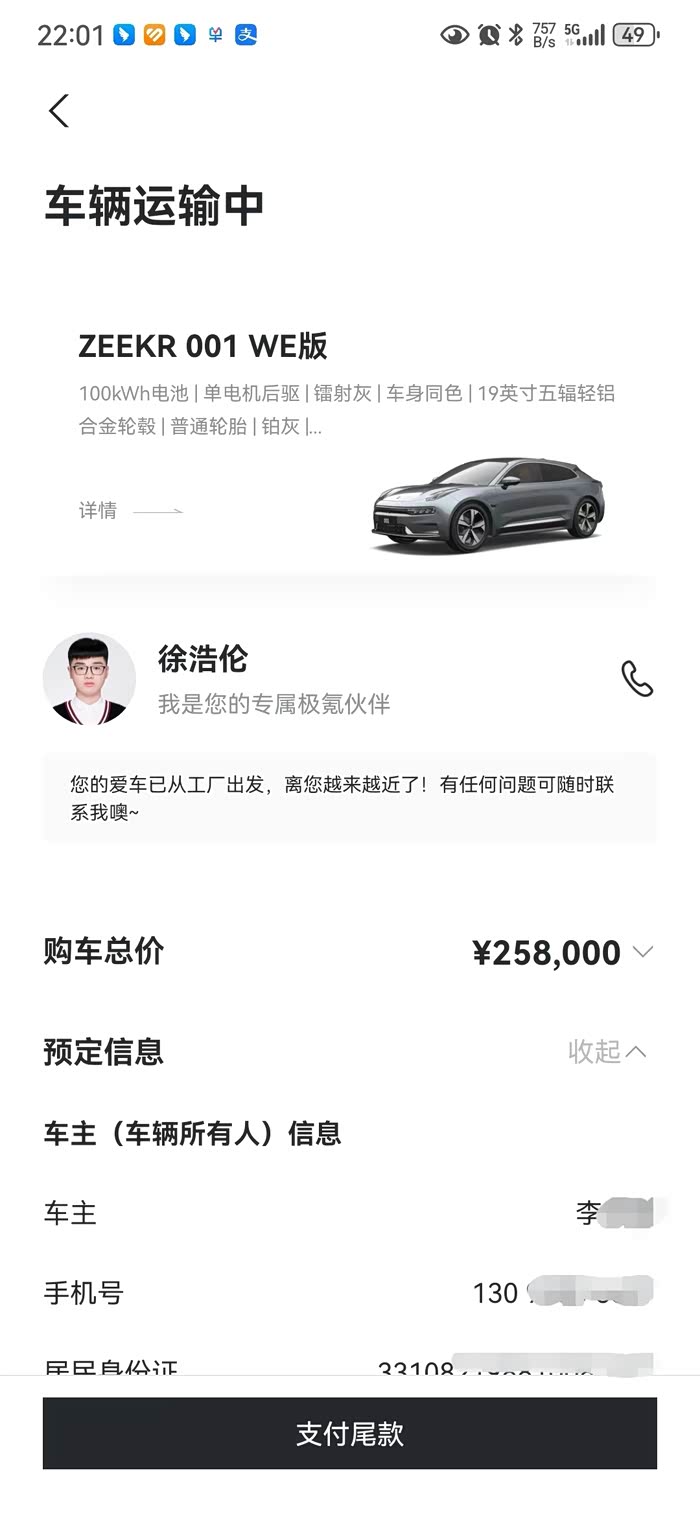 时间来到了9月份,有个做二手车生意的朋友收了台001,出于好奇去开了一圈,从此我的世界观崩了,怎么可以有如此高级舒服的底盘,有舒适更保持着操控性能,有着作为大型轿车的从容,无论什么路况从不露陷。从此这根苗子就在心里种下了,要啥09啊,我要001。接下来的日子就是枕边软磨硬泡了,终于在9月下旬某一天跟媳妇下午下班后晚饭都不吃专门驱车到隔壁县市(本地的极氪空间暂还未营业)试驾了001跟X,001试驾了ME版跟WE100,X试驾了双电机版本。一致认为X不是我的菜,底盘跟001差了几座山,X的底盘隔音感觉还不如我的领克01,属于纯小资车系。通过这样一折腾,001的豪华与舒适也在媳妇心里种下了草,有了这个草,何时订车购车就安排上了日程。因为资金关系,直到11月7日我才正式下定盖中盖版001,颜色选了灰色。关于动力,个人感觉WE版单电机完全足够,至于担心上新款被刺的问题,常规通勤代步为主很少长途高速,7KW家冲的用车场景,800V属于锦上添花的成分,车机个人觉得更是可有可无的东西,很少玩这些东西。我很清楚我需要的什么,所以在一片反对声中毅然下定。