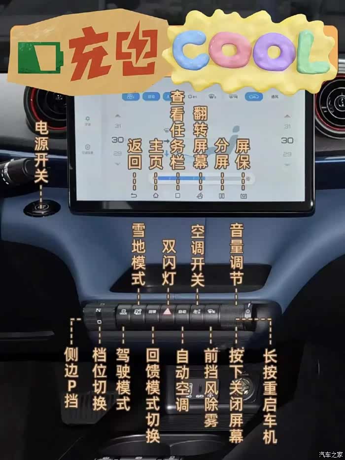 上:档位调节、驾驶模式选择、雪地模式、动能回馈双闪、自动空调、风扇开关、前挡除雾、媒体音量调节中:USB数据接口、SD卡槽、USB充电接口、12V 电源接口