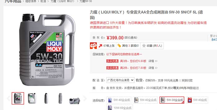某东活动,力魔(LIQUI MOLY) 专业雷夫AA全合成润滑油 5W-30 SN/CF 5L (德国)6.8折