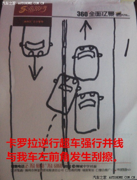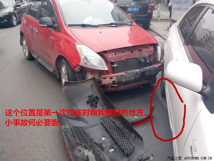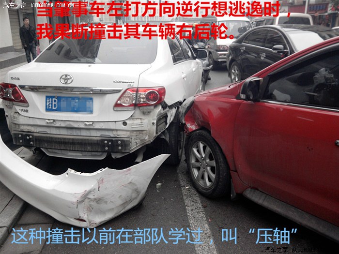 2014年的第一撞要从2月底的一天说起。那天下午四点左右我开车上班一路有些小堵,我提前一小时出门就为应对这样的路况,还听着970女主播美妙的音乐。就在车辆排队缓慢通行路口时事故发生了。一辆白色卡罗拉逆行强行超车并入我车道与我左前角发生碰撞。事故发生后的十多秒后我发现我驾驶室出不去刚想从副驾驶爬出来时,肇事车在移动并且看见前轮在原地往左打方向,我坐回了驾驶室,本能的告诉我:“他想跑”。