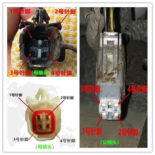 3、前桥插拔线缆包含四根线:两根作动电机供电线(1号、2号针脚,着车时,电压都是14v);两根位置反馈信号线(3号、4号针脚,着车时:4号插针13v 供电、3号0v 回路)。
