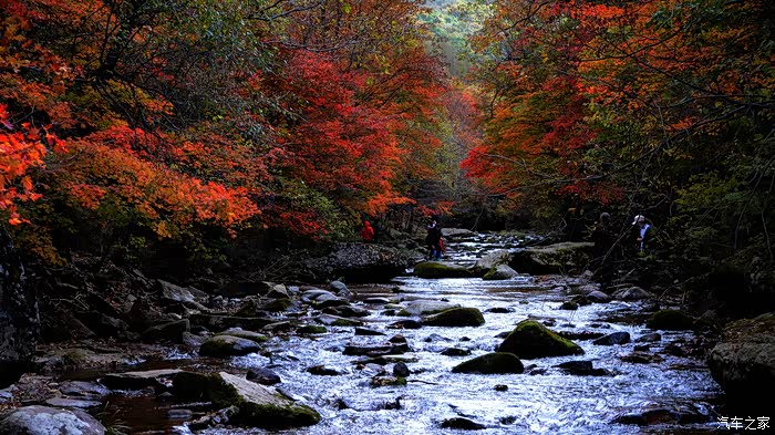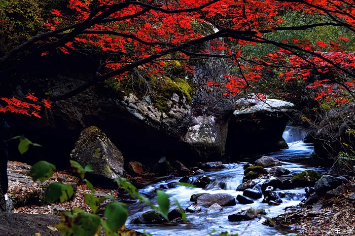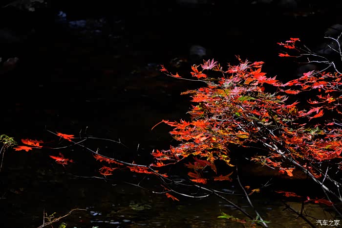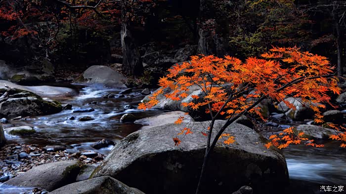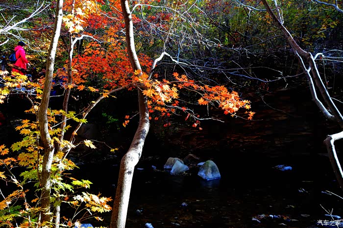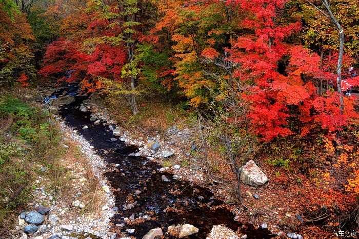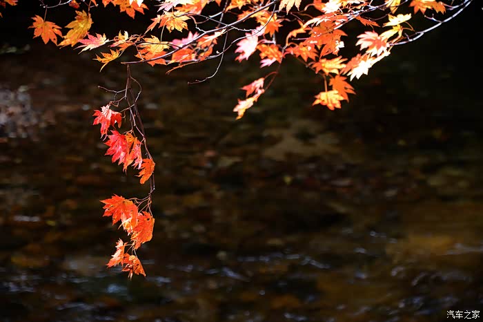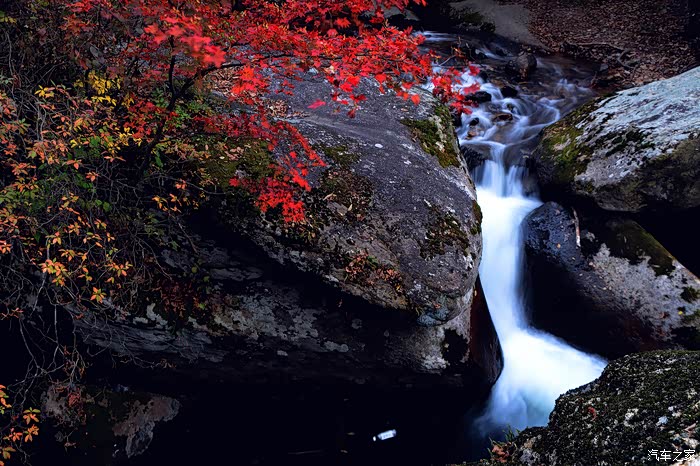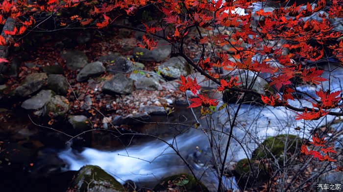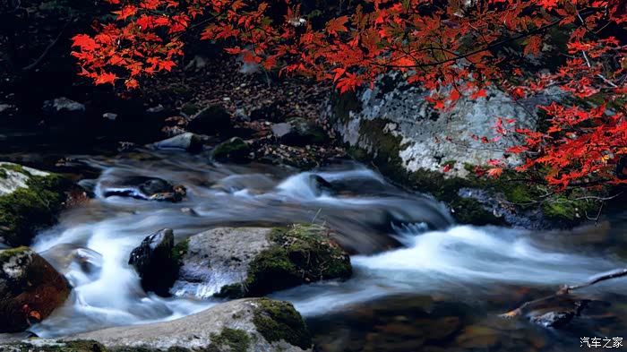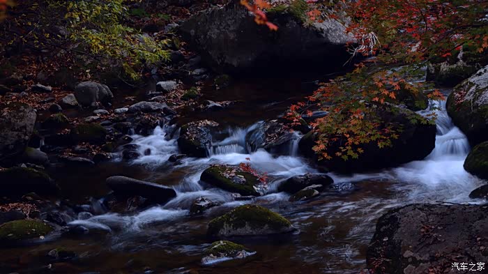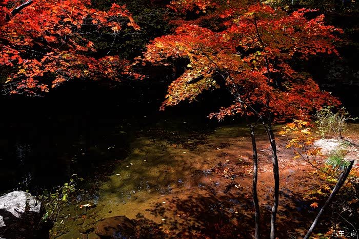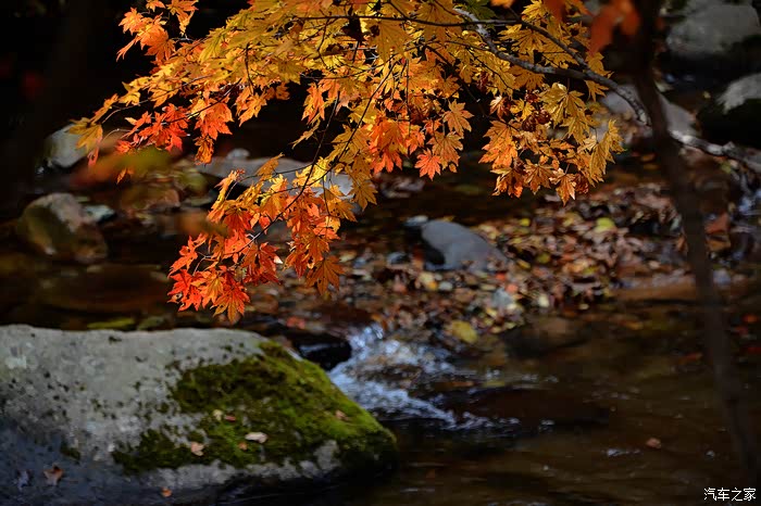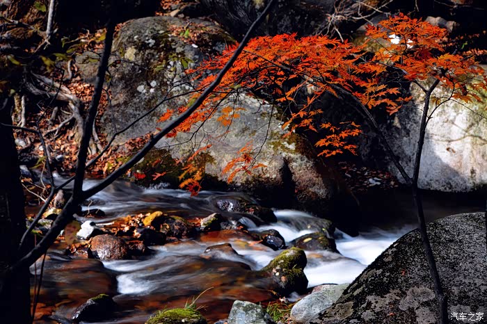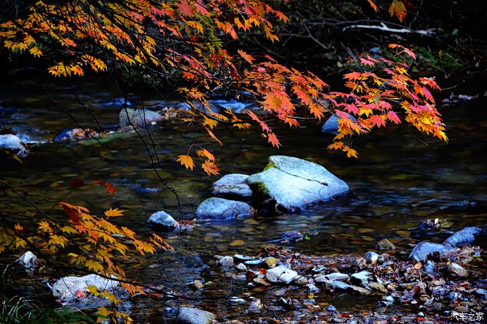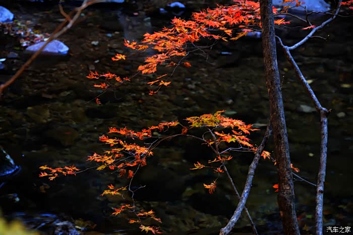 山石依然,河谷两侧的枫树正红,唯有溪水变幻了另一种柔美。