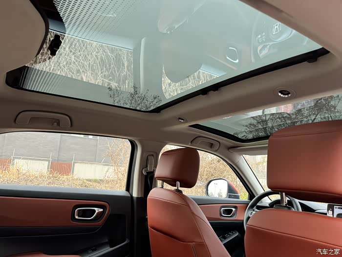 分段式天窗视野开阔,后排还有出风口。后排的空间也充足,坐三个人也没有拥挤感,坐直了头距离车顶有将近一拳的距离,视觉上也没有压迫感。