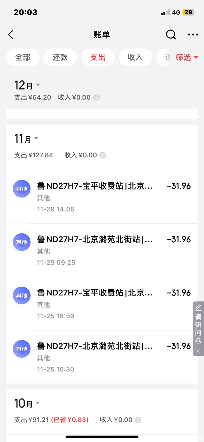 有时候我回天津都是走的高速,基本上一个月回去两次,单程高速费用32元,来回就是64元。