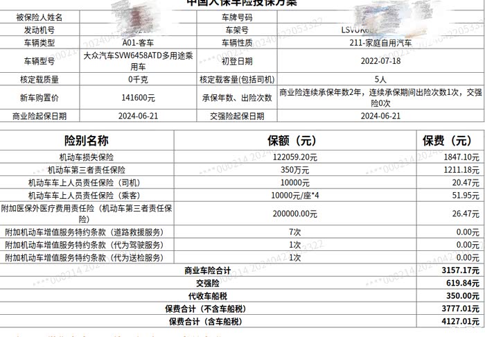 保险项:三者350万、车损、医保外用药,五项比较重要的。