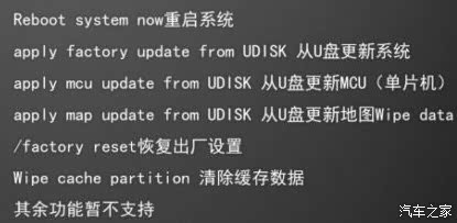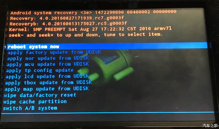 1.2在下面蓝色界面下用右上图的seek+键和seek-键上下移动光标到第8项“apply map update form UDISK”选项后按右上图的“TUNE”键确认开始升级地图,整个过程大约15分钟左右,升级完成之后会回到下面界面,这时候选择第一项“reboot system now”重启系统;
