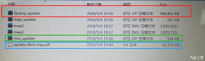1.4 Update文件夹里面文件说明如下图,红色框是MPU系统升级文件“factory_update”大约580M,绿色框内是MCU升级文件“mcu_update”大约534KB,蓝色框内是TBOX升级文件“update-tbox-mpu.sh”大约52.7M,其他三个文件(map_update\map1\map2)是地图数据升级文件总大小大约7.79G。后续刷机比如只需要刷MPU系统那就只需要拷贝红色框内文件就好,比如只需要刷TBOX那就拷贝蓝色框内文件就好,以此类推;