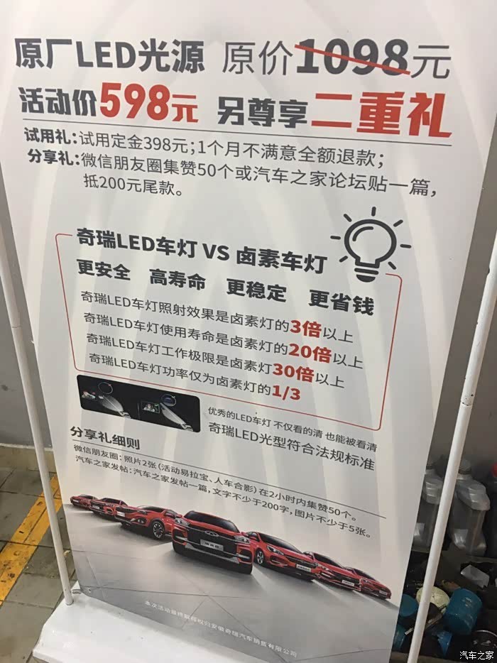 4年来从来没有把我丢在路过毛病也没有过就是胎噪有点大,最苦恼的就是就卤素灯晚开车视可以说完全看不到,一直想换疝气灯又怕像网说年审过就没换,直今天到奇瑞4S店看到LED灯活动立马联系前台交钱更换,原价1098,活动价598,另外在微信朋友圈点赞50抵200元现金,你以为完了吗??没有,还有就是在汽车之家发一篇关于这个活动的***也可以抵尾款200元,激动啊,我的眼前一片光明!