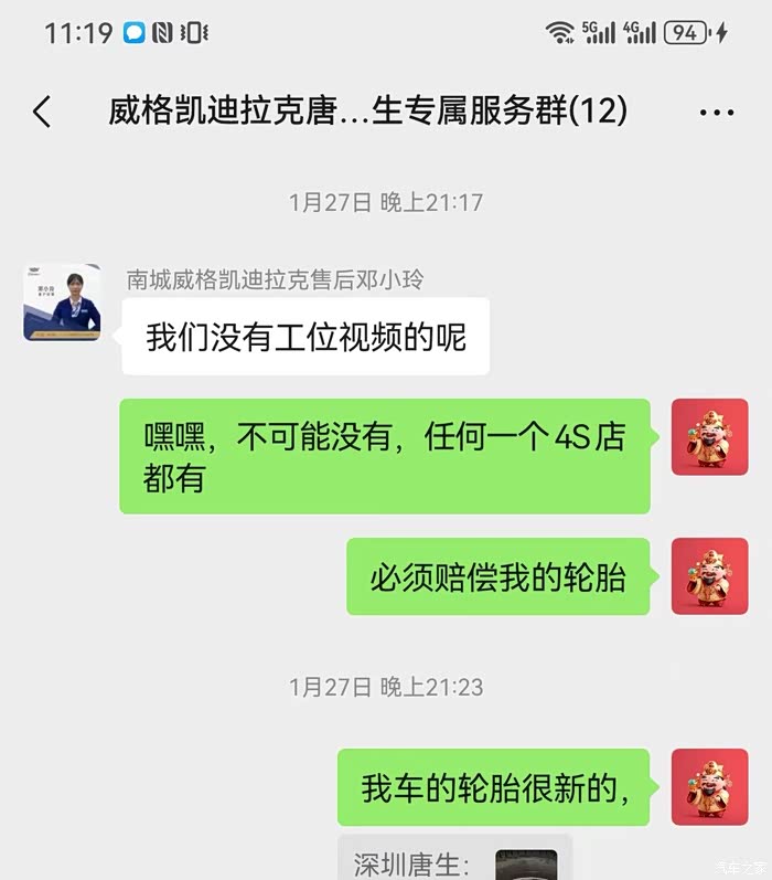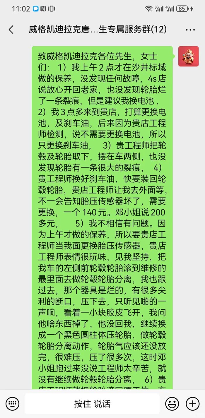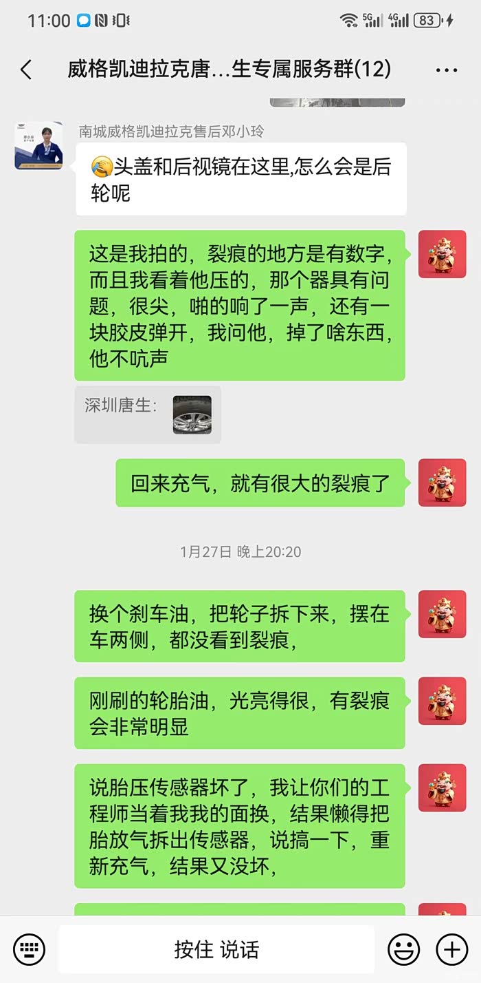回到家,我跟在群里跟她们沟通,他们说我车进店时拍照片,说我的车进店就有裂痕,这边调查清楚再反馈给我