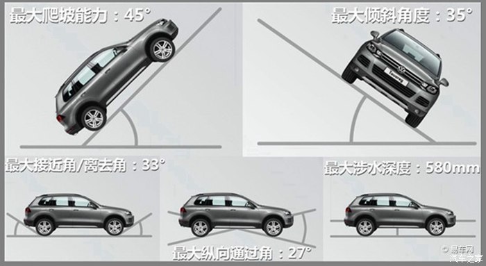 通过能力--与车辆的接近角通过角离去角等几何形体设计改造有关,涉水时还与进气喉排气管以及发动机气门点火ECU等部件的位置高度和防护等级有关。
