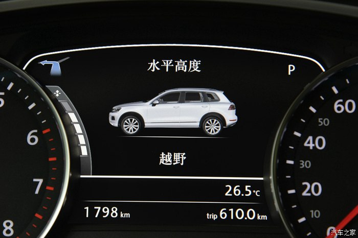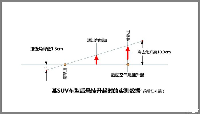 特别要说明的是,途锐的车身升高,是前后轴两个支点位置同时升起的,这是真正意义上的整体车身升高!这一点很重要。试驾体验途锐之前,我特地概略地大致测量了一辆带后桥可变悬架升降功能的SUV,这款只有后悬架升高功能的车在后桥部位升高后,以前悬挂为轴,车体前杠部分反而有稍许降低,这也意味着接近角的减小。当然,这种接近角的减小并不是实质性的,也不会过多影响什么。
