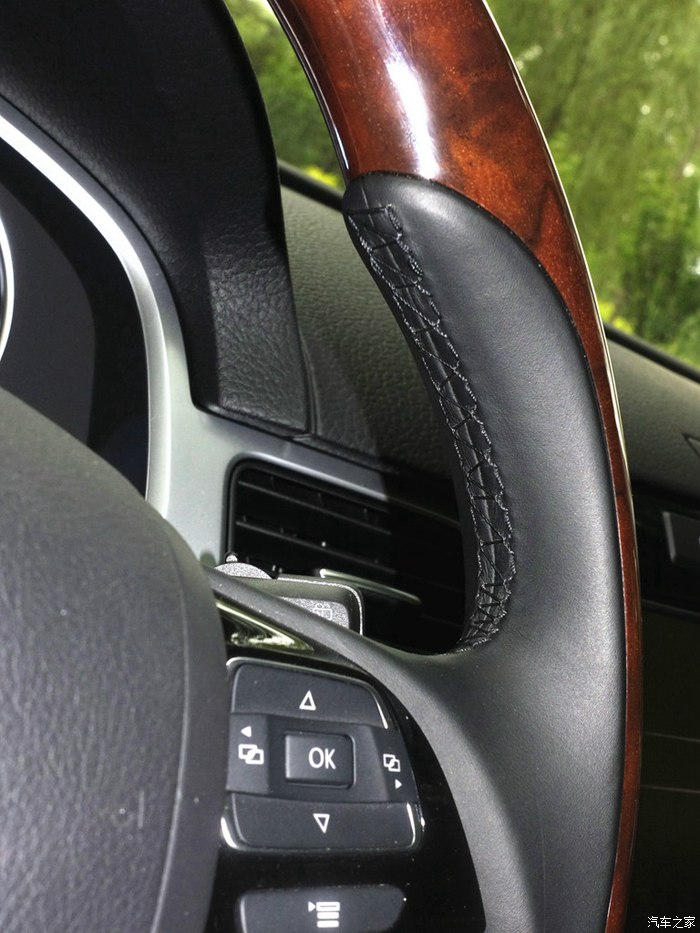 这款途锐的方向盘的把握舒适性也是相当不错的。按人体工程学设计的把握区域凸起,给驾驶者带来了很好的手感。在越野时,由于颠簸而滑脱的可能性大为减小。