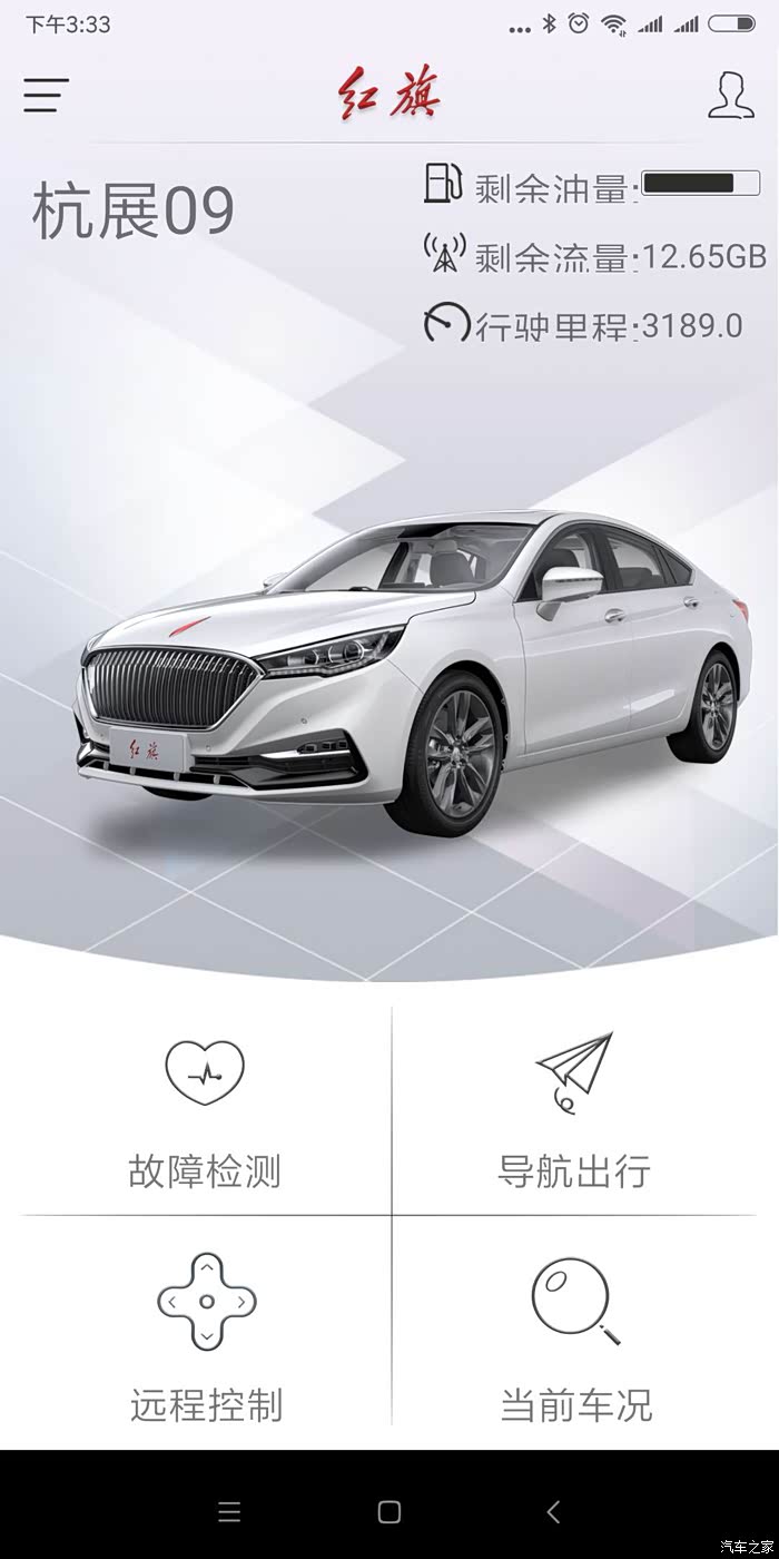进入首页,重要的数据在右上角“剩余油量”---检查需要加油?好规划出门行车路线。“剩余流量”---手机红旗APP剩余流量,检查是否需要补充?“行驶里程”---已经行驶的里程,检查是否需要计划回店做保养了?下面是四个功能页面(故障检测、导航出行、远程控制、当前车况)的选取。