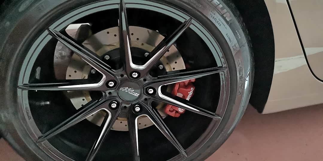 前轮安装好后的刹车盘和大卡钳,漂亮