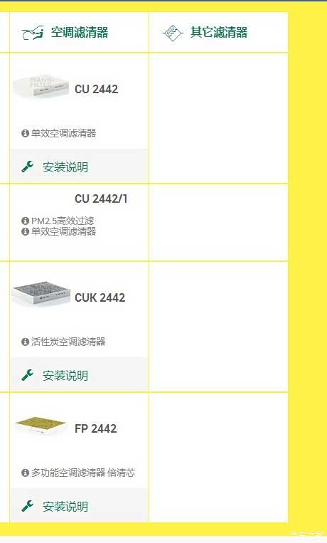 空调滤:CU 2442、CUK 2442、FP 2442(三种型号选一种,具体区别下面会介绍)