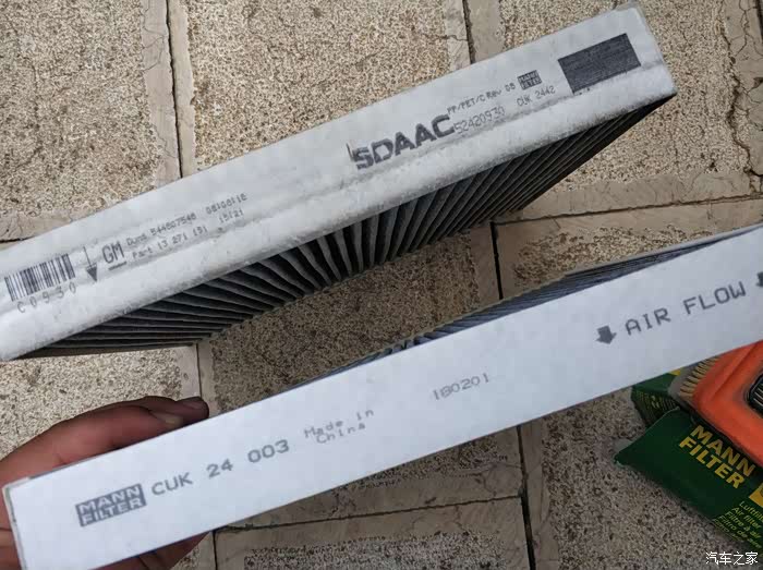 这里的空滤买错了,买成的CUK24003的了,等拆开才发现,原车的是2442的。24003和2442大小是一样的,只是24003比2442薄。所以大家也不要太相信途虎上的型号,我在曼牌的官网上看,大宝