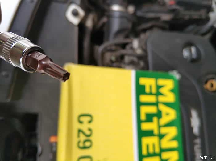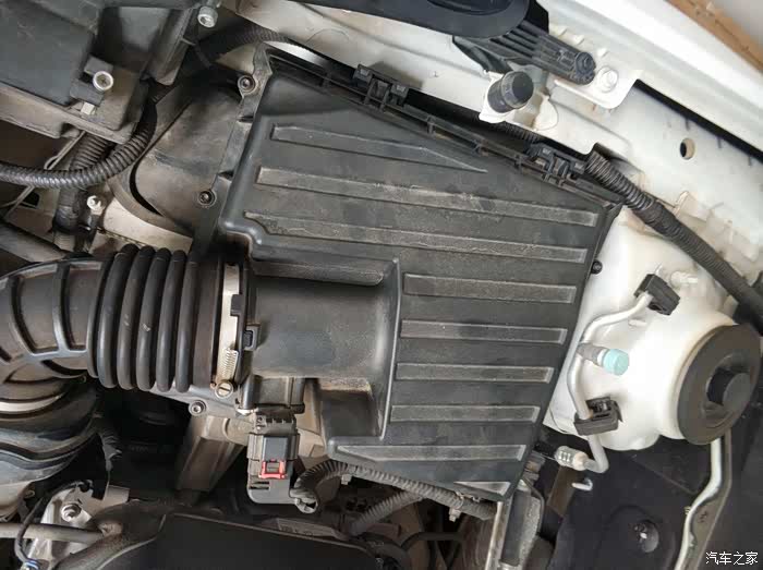 滤芯和起子准备好,换空滤比换空调滤简单多了。拧松改上的六个螺丝,螺丝取不下来,完全拧出来后,是待在盖子上的,不要大力出奇迹哈。拧右边上面的螺丝的时候,因为线路挡着要注意点,用手轻轻扒开线路拧就行,不要