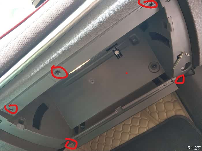 手套箱取下来后,就是这个样子滴, 然后用7号套筒扳手,把这5颗螺丝取下来,上面3个,下面2个,可以完全取出,不然箱壁拆不下来。