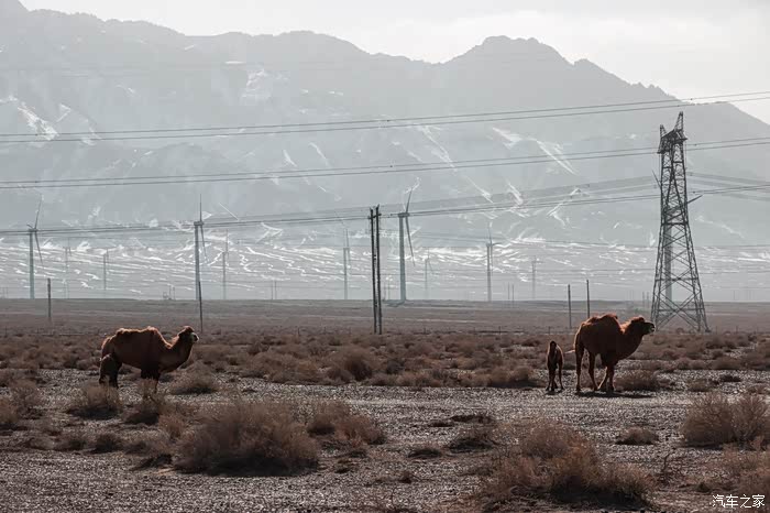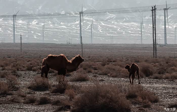 天山山脉下是一片荡漾的湖泊,若是天气晴朗,必定很漂亮。两岸的草场还是一片枯黄,4月的春风还没有吹到这里,现在这个气候只有动物能适应,往回走的路上遇到了几头骆驼,小骆驼看到我下车,惊慌地向它妈妈跑过去寻求庇护,感觉到我没恶意,也慢慢地放松下来。