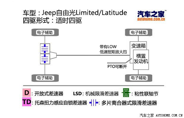 ECOnnect系统,顾名思义,经济是其很重要的一点,这就是采用了PTO拨叉,通过这个减少由于使用分动箱和中央差速器等带来的动力损耗。请看自由光上2.4L顶配车型用的四驱形式,其与3.2L TrailHawk版的区别在于后者后桥的差速器有锁止功能,能够保证一侧打滑的时候,将动力完全传到另一侧车轮。