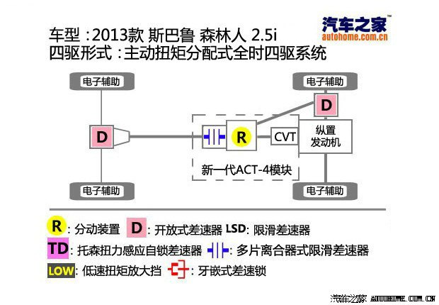 相比之下,森林人的结构就相对复杂一些,加入了分动箱。它的基本原理是:动力从发动机输出,进入ACT-4模块,ACT-4模块内部包括了全新的CVT变速箱、分动装置、电控多片离合器式中央差速器,从ACT-4模块输出的动力按照一定比例分别输送到前、后桥,实现全时四驱。日常驾驶状态下前、后桥的动力分配比为70:30,极端情况下理论上最多可以达到50:50,而这之间的线性变化完全由电脑掌控,另外它还可以通过辅助制动系统来实现轮间限滑功能,提高野外脱困能力。