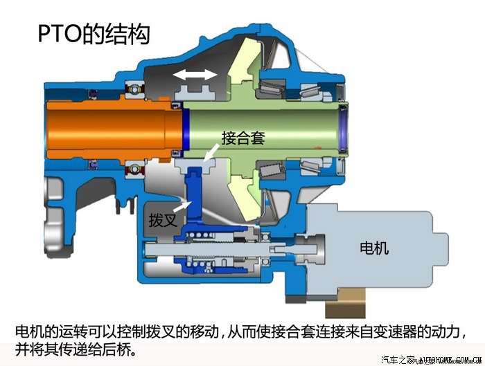 前轴为一个PTO(齿形离合器),位于横置动力总成的变速箱输出端,通过内部的电机驱动拨叉,用来切断和连接通向后桥的动力输出。PTO部件是传统四驱系统所没有的,它的加入可以使得在两驱模式下,动力完全闭锁在前桥,省下了传动轴以及传动齿轮空转所产生的不必要损耗。前后桥动力分配是100:0。