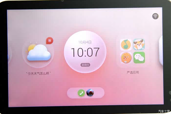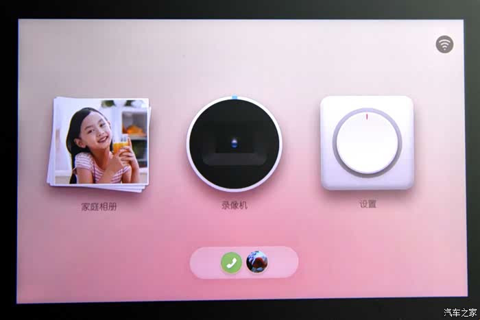 小鱼的桌面。屏幕是电容触摸屏,向左向右滑动 切换更多功能页面。下方是已连接的手机端用户的视频电话激活按键