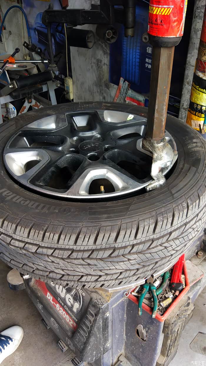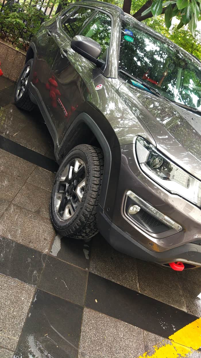 2017款JEEP指南者2.4高性能四驱版,6月13日提车,6月23日上牌,轮胎已经买了一个月了,一直放着等着提车,上牌之后才能换,今天早上驱车20多公里,到朋友的店里去换轮胎,从厂家要了4条,结果厂家发了8条过来,现在还剩下4条,今年的全新胎,南京周边的车友要是有喜欢的,可以过去拿下,7月1日之前没人要,就要退回厂家了,因为这个真的没什么人用。除非你有这方面的需求,像我,主要就是“zhuangbi”用。介绍一下佳通AT100。全地形轮胎,再往上就是MT了,那个真是玩车才用的。这个全地形,既满足平时城市使用,又满足周末或者自驾游出行,offroad使用,重量比原车配的胎,重了不少。所有厂家都在想办法减轻簧下质量,可想要用AT,就没办法,AT胎都是很重的,我估计应该会有12斤吧,具体我也不是很了解。指南者2.4高性能四驱版,原配马牌ConitCrossContact Lx2.定位HT。反正花纹啥的,和普通公路胎有明显的区别,花纹很深,导致有个问题,卡石子特别严重,开起来哒哒哒哒的。静音很不错。舒适性很不错,油耗表现,因为我目前才1000多公里,城市综合路况加我的用车环境,油耗稳定在10.5。可是放在指南者上,确实差了那么一丢丢。有点文文弱弱的。之前看有个车友换了这个,后来想和他咨询讨论,可他好像最近太忙没消息了。自己做小白鼠吧。换胎的过程中,几个重要的地方我都拍了。因为有媒体测评说换胎可以换的那些尺寸,是有前提的,我这次发帖,就是展示一下,指南者在保持原车状态下。不加任何东西,只换轮胎后的介绍。下面图片中我会详细说一下,这次照片多,为了能详细的给大家介绍哦。想换胎的小伙伴,仔细看看。