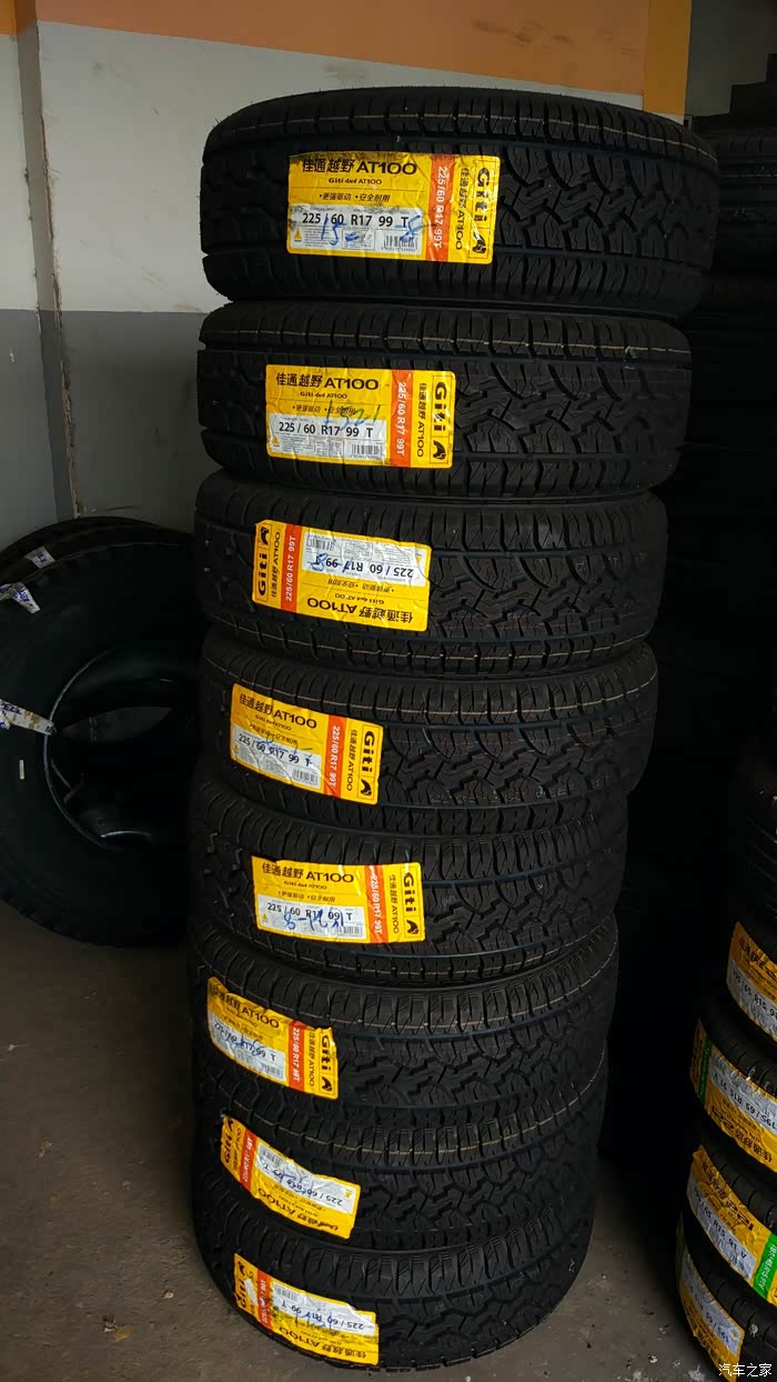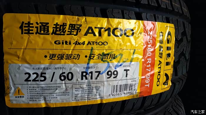 着就是佳通AT100。之前家家里有介绍这款轮胎的,那时候才上市,没有那么多尺寸可以选择,这款225 60 R17,也是才出不就,就尺寸来说,确实是小众中的小众。