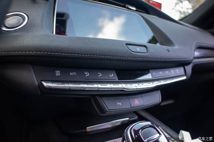 中控台用皮质材料包裹并配合缝线作为装饰,显得比较精致。下面就是一块嵌入式的8英寸的中控屏幕。支持CarPlay、导航、车联网等功能,实用性较强,屏幕下方的空调控制区域呈狭长式分布,其金属按钮质感十足。