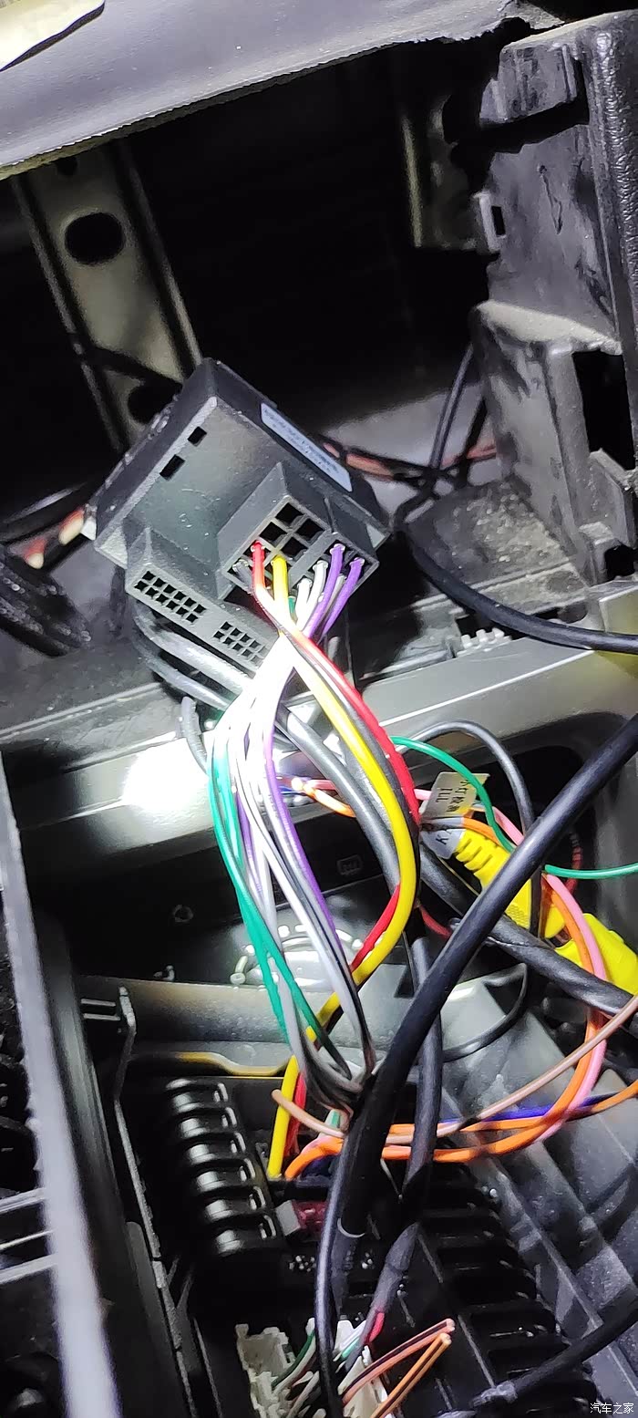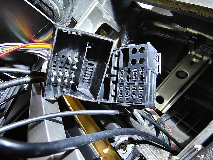 连接线路,我装了主机带的标致专用线,一头接主机一头接原来接RD43的线束,把专用线和倒车影像控制线接上。这里其实可以看到左边的主机线束插头和右边的原车线束其实针脚是对不上的。只是当时我没注意。