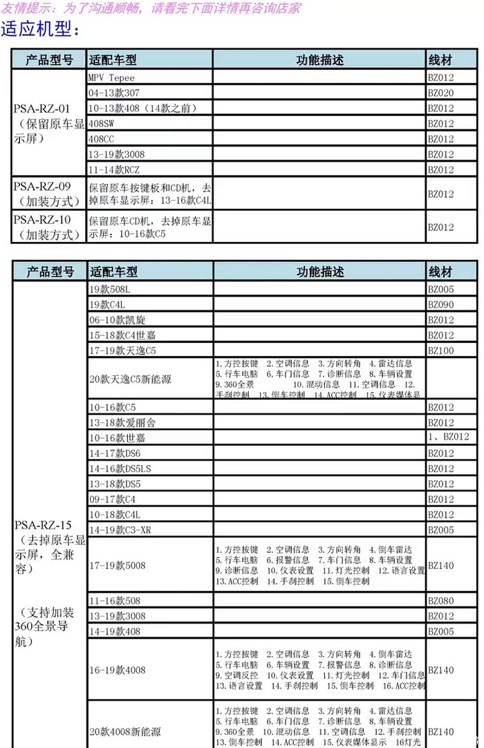 2、协议盒半壁江山是睿志诚,它的公众号里有各类资料,很详细。对标致来说,无非01和15两种,307和老408这种带C屏的用01,13年以后的肯定是15。而且15可以支持360全景。淘宝的梦现xxxx这家都有卖,价格72(15),78(01)带线。和睿志诚的技术人员也打电话咨询了,很顺畅。