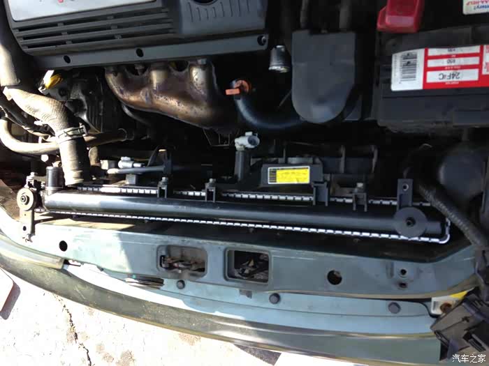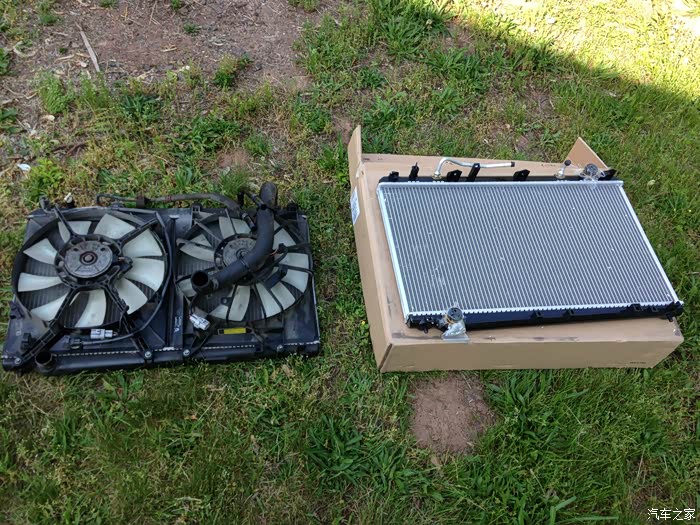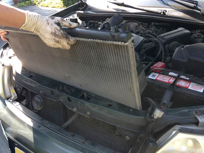 既然是教学贴,就要先简单介绍下发动机冷却系统。发动机运转起来之后是要不断产生热量的,这就需要冷却,并且把发动机维持在正常的工作温度,散热器就是用来给这个系统降温的。正常汽车前面应该有两个长得像散热器的东西,其中一个是空调系统的冷凝器,另一个才是真正的散热器。 简单地说吗,散热器就是金属叶片做成的网状物,冷却液从中通过,把热量传递给空气。既然要有循环,就至少有两根管子,一进一出。而在实际散热器上还有散热风扇,用来在需要时加强散热效果。自动挡车型,还有自动变速箱油冷却管从散热器中通过,用来冷却自动变速箱。所以,要更换散热器的话,先要放掉冷却系统内的冷却液,然后至少需要断开两根冷却液管,断开冷却风扇插头,有的还有温度传感器插头,以及变速箱冷却管。把这些连接都断开后,就可以把散热器提起,连带散热风扇一起拿下。拿出旧散热器之后,把必要的部件转移到新散热器上,然后把他们原样装回,装满冷却液并且排掉系统内空气。这样散热器就换完了。