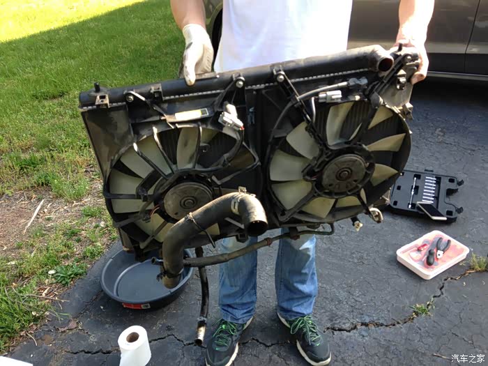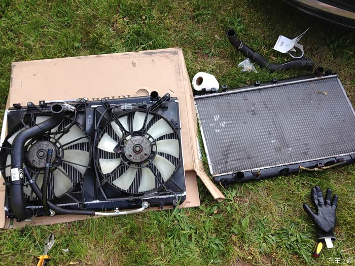 补充一下,换散热器用到的工具和材料挺简单的,套筒扳手,开口扳手,螺丝刀,钳子(最好备上长的短的,弯嘴的用来打开皮管卡子),接水盆,漏斗,空瓶子,新防冻液,新散热器,一些清理用品,就能完成这项工作了。