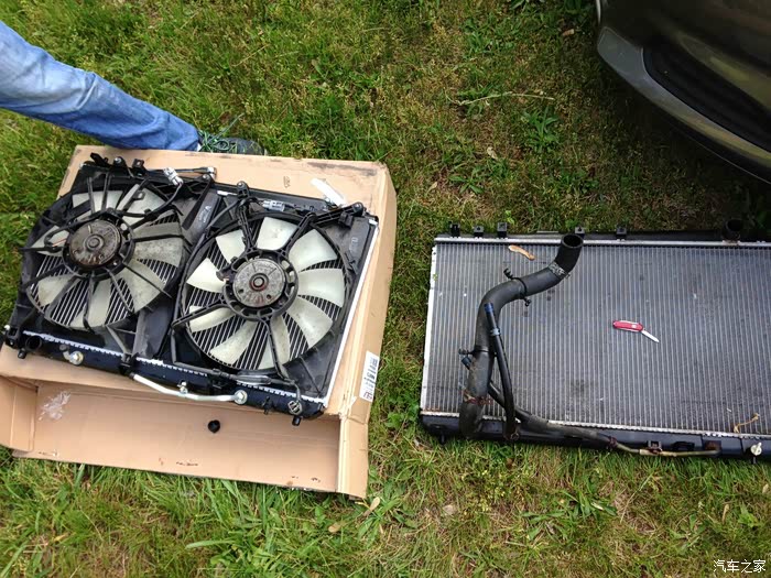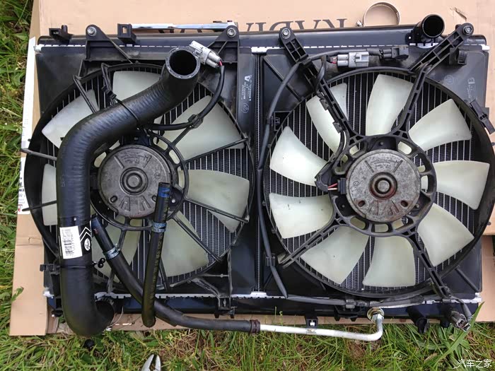拿出来的散热器总成。我们要把上面的风扇,传感器和管子转移到新散热器上。