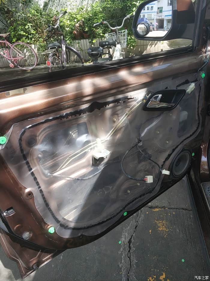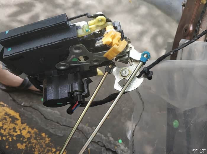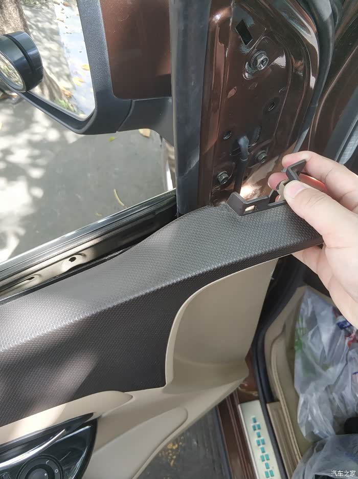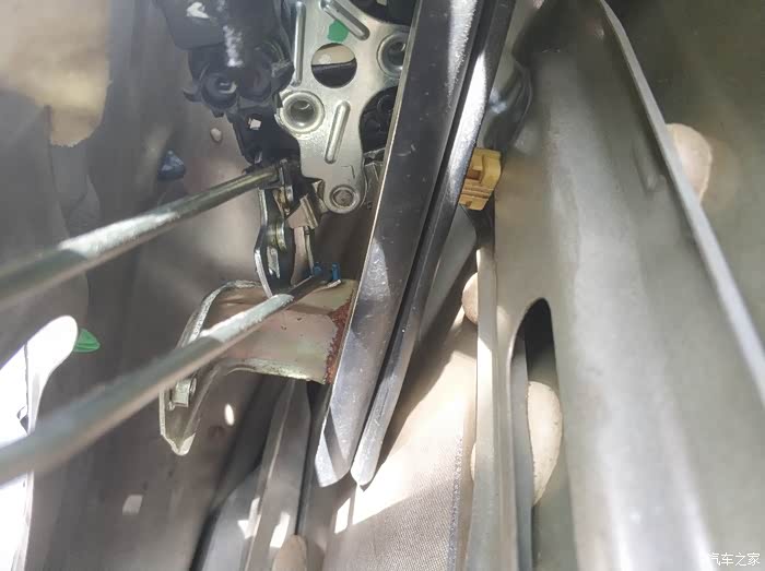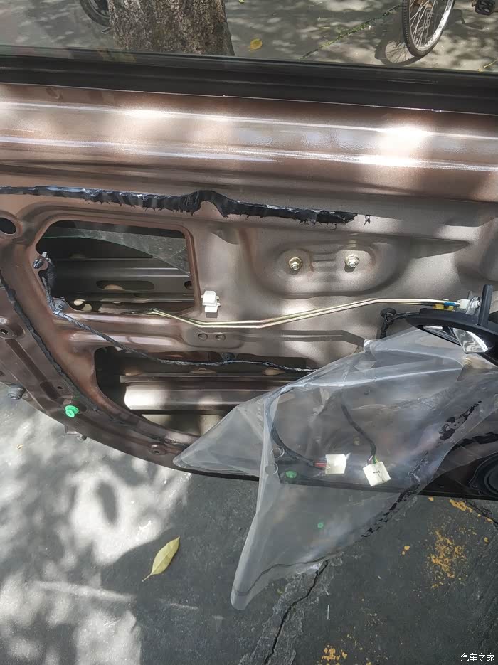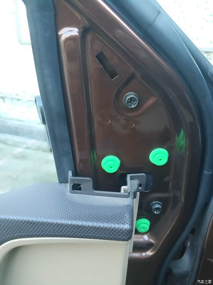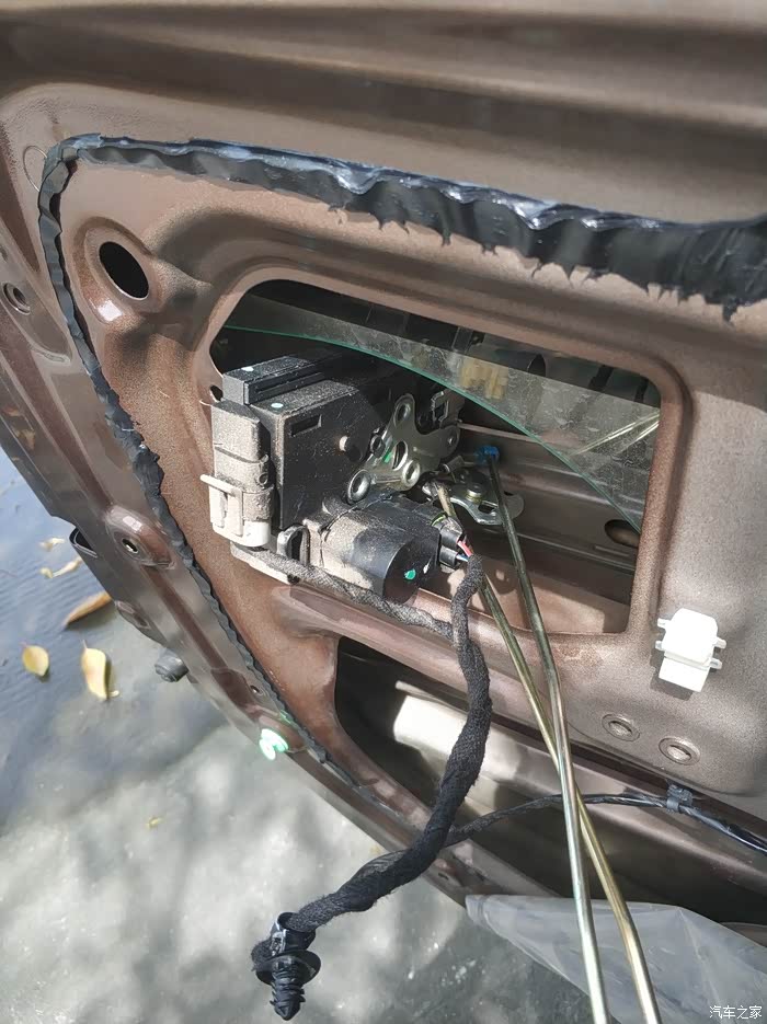 拆中控锁之前,把锁上面的两根铁棍取下来。一个是钥匙孔的,一个是把手的,这个角度不好看,再自己要摸索。玻璃要升一半。,不然玻璃在下面折不出来的,挡住了。