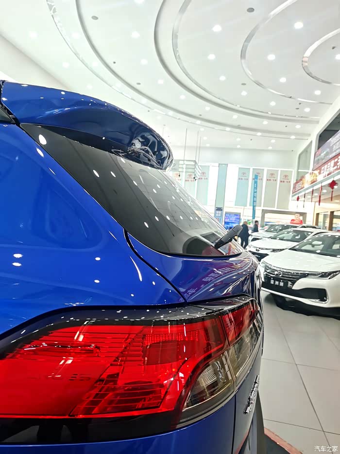 车尾门上方,短而敦实的后扰流板。车顶尾部中央,同色的鲨鱼鳍。