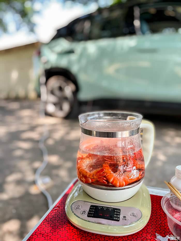 玩法多的好处就是就算没有鱼上,我们也可以吃吃喝喝,火锅已经好了,我们煮了牛肉,生菜,还带了大虾,这个虾质感很不错,口感很好哦,用电就是方便,各种用电设备都能在户外使用。虽然这里今天渔获不行,但这个环境还是挺适合的,可能开闸的时候鱼更多。