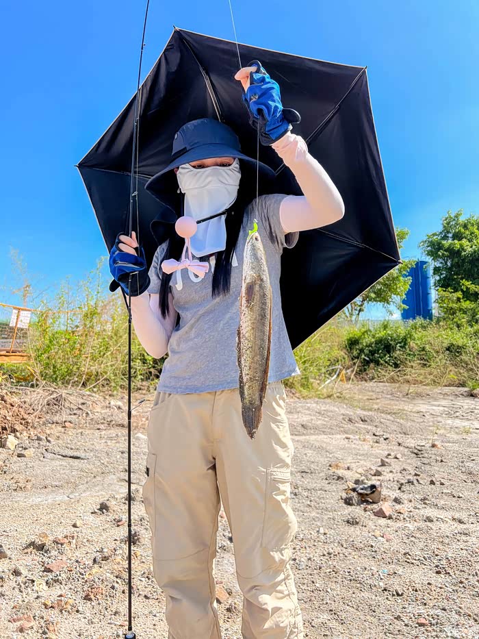 与上一个钓点相比,这个就比较艰苦一点,很晒。没有树只能自己打伞。但这里的好处是鱼比较多,我们看到很多大鱼在炸水。而且就在边上。我们也尝试很多饵,因为钓友在这边上过丁公鱼,鲢鱼,罗非,黑鱼等等。