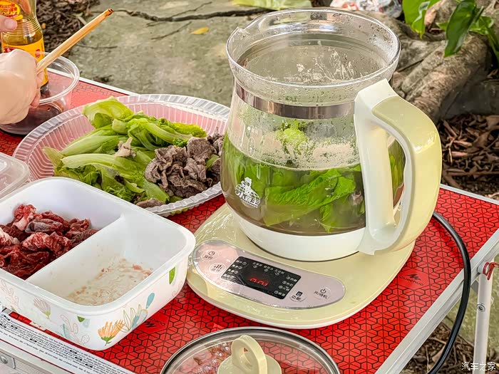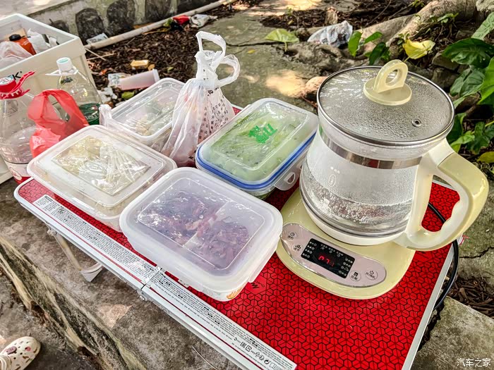 我们把车子停在树底,接着把一些桌椅搬下车,今天是用电来打火锅,电动车的精髓之一就是这个放电功能啊,这是一个超大号的移动电源。我们把放电枪插到慢充口,打开放电开关,插排打开就有电了。