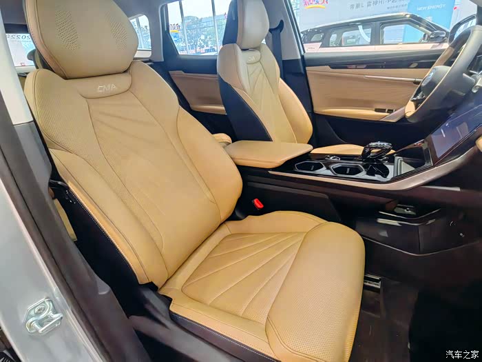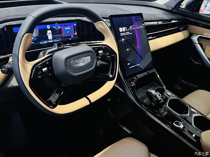 这个内饰颜色是秋日原野棕(蓝+棕),混动车和燃油车的颜色不一样,但都是双拼内饰设计,方向盘也是四辐式的多功能方向盘,还有皮制包裹,并且手感还不错。它全系标配10.25英寸数字液晶仪表,13.2英寸的中控竖屏看着也非常带感,看导航操控按键特别爽。