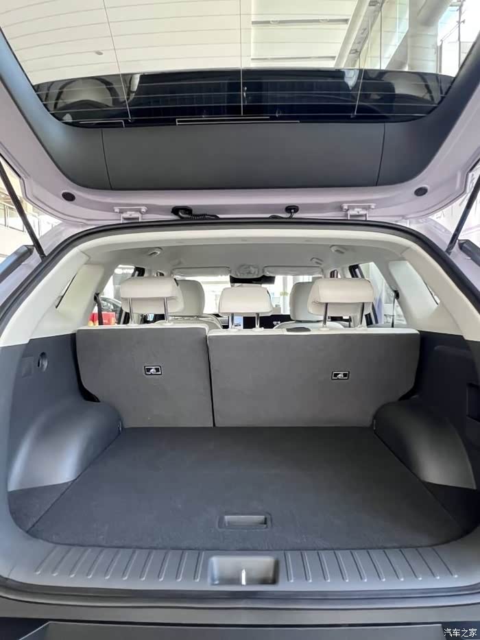 前排感受完之后,我们又在后排看了一下,空间很宽敞,我一米八多的高个子坐后排,都轻松自如,头顶也有一拳多空间,完全不像一台紧凑SUV。车内有着很多燃油车和电车融合的设计元素,全景天窗配遮阳帘,比那些天幕的电车好多了,而且后排门框、扶手箱等多处地方加起来有20多处储物空间。