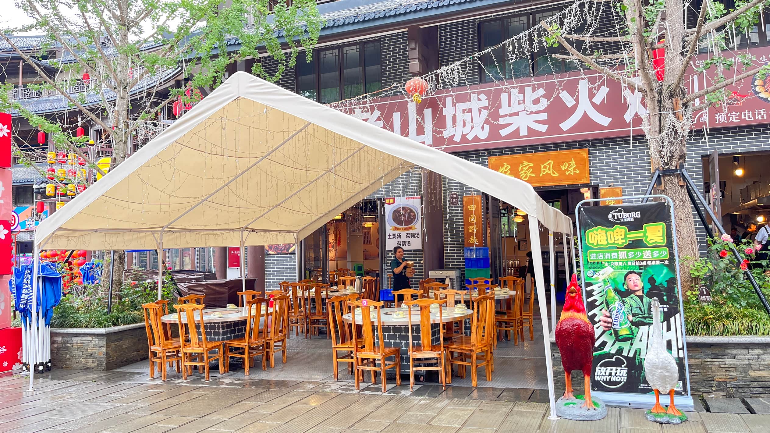 漫步荣乐古街,青石板路被岁月磨得发亮,两旁木楼的飞檐挑着红灯笼,与远处的黛色山影相映成趣。老茶馆里,盖碗茶的热气袅袅升起,几位老人摇着蒲扇闲话家常,时光仿佛在这里慢了半拍。
