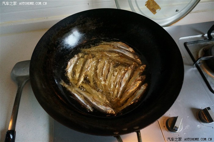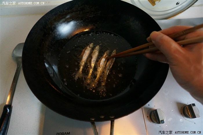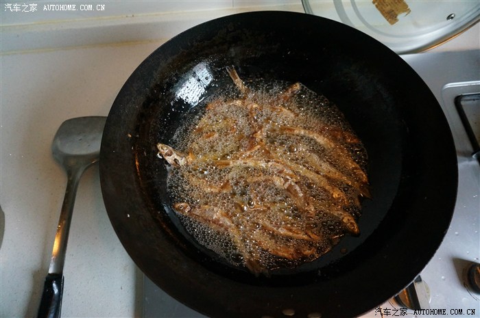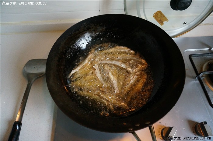 LP炸完排骨后,将锅内热油用滤勺滤去杂质后,再将油加热至5分热,指示刁子鱼下锅