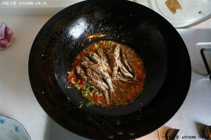 把蒜未、辣椒丁放入锅内,加少许盐,翻炒...再把炸好的刁子鱼盖上...淋少少陈醋